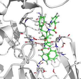De estos compuestos el que tiene mayor afinidad por la proteína es el compuesto 18939759 que se encontraba en el grupo del Indinavir. En la figura 1 se muestra los sitios de interacción del ligando con la proteína correspondientes a los residuos; Asn 301, Asp 86, Thr 222, Thr 221 (con dos interacciones), Tir 225 y Asn 131. En la figura 2, se muestran los sitios de interacción para el ligando clásico de la SAP-2, A70 que corresponden a los residuos Asn 301, Thr 221, Asp 218 y Asp 86, lo que muestra un menor número de interacciones al compararlo con el compuesto 18939759 que mostró una mayor afinidad por la enzima. También se realizaron otros análisis utilizando compuestos quinoidales y AINES, los cuáles mostraron scores muy bajos o negativos. Sin embargo en el análisis realizado para algunas estatinas, de acuerdo al valor obtenido en los scores, podría sugerir una posible interacción de algunas de estas moléculas con la candidopepsina-2.