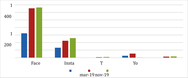 Figura 66. Estadísticas de seguidores y suscriptos de mayo y noviembre 2019 y octubre 2020 como muestra de la dinámica en redes del proyecto. Nota: Elaboración propia.