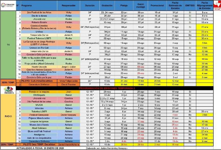 Aunque con la vinculación de la nueva asistente de producción, a quién se designa como secretaria de producción en la organización institucional debido a su escasa experiencia en el puesto y a las labores de secretariado que debía realizar, se ganó mucho en la consolidación del esquema propuesto desde la dirección de producción, llevando a cabo de manera profesional tareas de asistencia; se reordena todo el material, se organiza diligentemente la producción, con una mejor sistematización, un mejor manejo de los archivos e incluso se inicia una tarea de recuperación de formatos de cesión de derechos faltantes para cada programa. Y se llevan a cabo las relatorías de las reuniones, por otro lado, no fue un acierto la vinculación del segundo asistente de producción, encargado de la producción de campo.