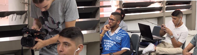 Debo hacer aquí un inciso a la coincidencia del momento de configuración del equipo de producción de las series con la circunstancia de que caí enfermo, y que vivía en una ciudad a una hora y media de la Universidad. Por lo cual debí depositar la confianza en mi asistente la recién egresada Nicole Bravo, quien hizo un excelente trabajo, quien después de tres semanas aproximadamente, encontró un nuevo trabajo y, seguido por contingencia, debía vincularse una nueva productora, en tanto que el director radial y coinvestigador del proyecto, propuso a Aura Camila Lerma, quien junto a Natalia Casas, se encargan de la producción operativa, la última que ya había participado anteriormente del proyecto, en El Gran Ausente, (experiencia para la que se creó un equipo de producción provisional2) se integra formalmente como monitora encargada de la producción de campo, coordinada por Aura, integrada como mi asistente en calidad profesional. Yo mantenía a la dirección de la producción y de la serie audiovisual, mediante los canales de comunicación constante que había creado para ello, así como la instalación de la oficina virtual, donde se acopiaba todo el material sistematizado del proceso, mientras mi convalecencia, y aprovechaba para adelantar documentos administrativos, tanto informes para Políticas Culturales como para el proyecto que se encontraba en cierre. Aura se encargaba de atender el día a día en la oficina física, que ya se había adecuado en el cubículo docente de José Hleap de la escuela, quien siendo decano mantenía su oficina en la decanatura.