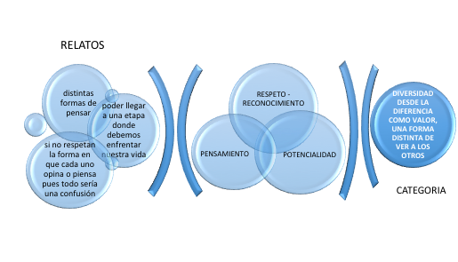 En resumen, para los educandos la diversidad contemplada desde la diferencia tiene significados que transitan entre discursos vistos desde ideales, pensamientos, concepciones, gustos, intereses, ritmos de aprendizajes, potencialidades, habilidades, características, formas de ver y sentir la vida, pero también la reflejan desde sus escenarios naturales de convivencia, descentralizándola del mismo sujeto. Coincidiendo en que la heterogeneidad es los más natural de su contexto y la igualdad es un precepto del reconocimiento de derechos, argumentando que la diferencia es la que permite crear y entrelazar vínculos afectivos con quienes hacen parte de su ambiente.