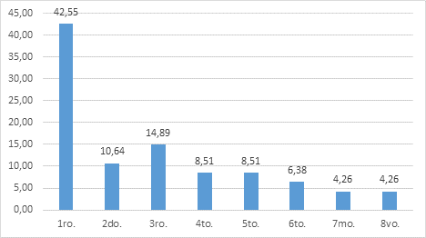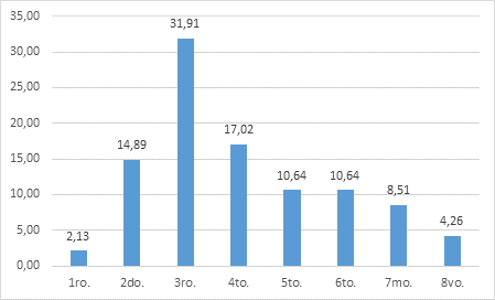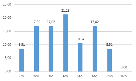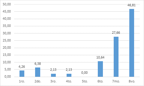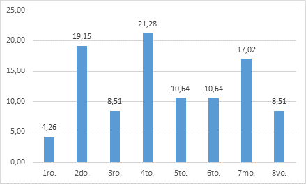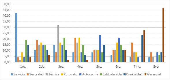 En referencia a las “Anclas de Carrera”, el Ancla “Servicio” resultó la determinante en los estudiantes, la cual se relaciona con el interés de ayudar, alcanzar la realización moral, trabajar para otros y prestar servicio social. En contraposición, el Ancla menos valorada fue “Gerencial”, el 75% de los participantes la jerarquizaron en el séptimo y el octavo lugar (últimos lugares en la jerarquía). Estos resultados coinciden con los obtenidos por Wils et al. (2010), quienes entre las conclusiones de su estudio, determinaron que el Ancla “Gerencial” correlaciona negativamente con el Ancla “Servicio”.