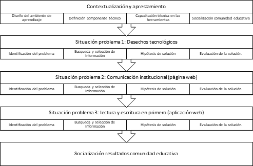 De acuerdo con el propósito de esta investigación, el proyecto de aula se llevó a cabo siguiendo la línea del Aprendizaje Basado en Problemas (ABP), que es una estrategia de enseñanza y aprendizaje que incentiva en los estudiantes el desarrollo de habilidades tendientes a la solución de problemas. Los estudiantes que optan por esta estrategia, conforman equipos de trabajo colaborativo, con el fin de identificar un problema real, analizar el problema, proponer alternativas de solución, poner en práctica la solución y evaluarla. Los problemas que emergieron de los intereses de los estudiantes fueron los desechos tecnológicos, la comunicación y publicación de información en la institución educativa, y el aprendizaje de la lectura y la escritura en la básica primaria.