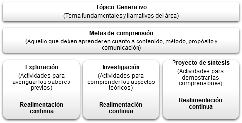 · Para Barrera y León (2014), los tópicos generativos “representan los conceptos, ideas o eventos centrales sobre los que nos interesa que los estudiantes desarrollen comprensión. Los Tópicos generativos van a la esencia de cada disciplina” (p. 29), son temas significativos propios de cada área (Stone, 1999). Éstos, se pueden relacionar con aquellos temas estructurantes de cada área, asignatura o proyecto contemplados en documentos públicos, tal es el caso en Colombia de los Estándares Básicos de Competencias o los Derechos Básicos de Aprendizaje. Del mismo modo, pueden surgir de las programaciones curriculares institucionales. Sin embargo, deben ser significativos y enganchadores, que apasionen a los estudiantes por el conocimiento.