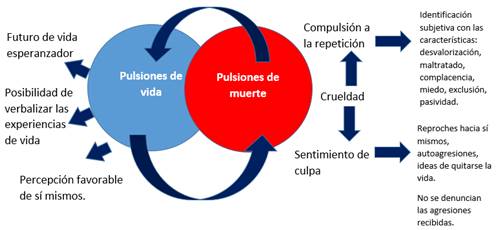 Fuente: Elaboración propia donde son señaladas los movimientos y las manifestaciones de las pulsiones de vida y las pulsiones de muerte.