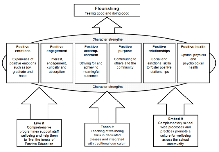 El primer modelo de Educación Positiva fue creado en la Geelong Grammar School, un colegio australiano que fue uno de los pioneros en introducir los principios de la educación positiva en las aulas. El modelo incluye los cinco componentes del modelo de bienestar de la Psicología Positiva PERMA (emociones positivas, compromiso positivo, relaciones positivas, propósito positivo y logros positivos), añadiendo un sexto componente denominado “salud positiva”. Este modelo hace énfasis en la promoción de una salud mental positiva y el desarrollo de funciones adaptivas que puedan ser realizadas en contextos reales como la escuela, donde se promueva el bienestar en paralelo con el éxito académico (Norrish et al., 2013).